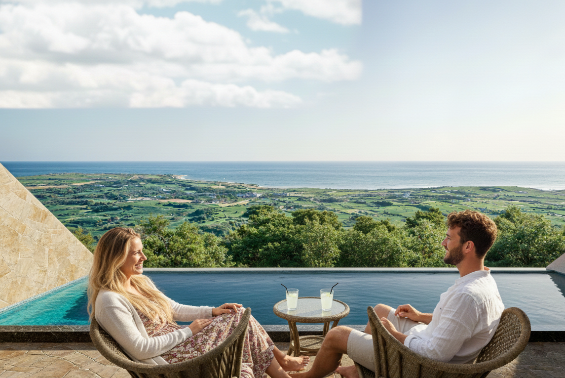 日中は広大な自然の中プールを楽しみ、夕方はプールサイドでドリンクを片手に夕日を眺める。